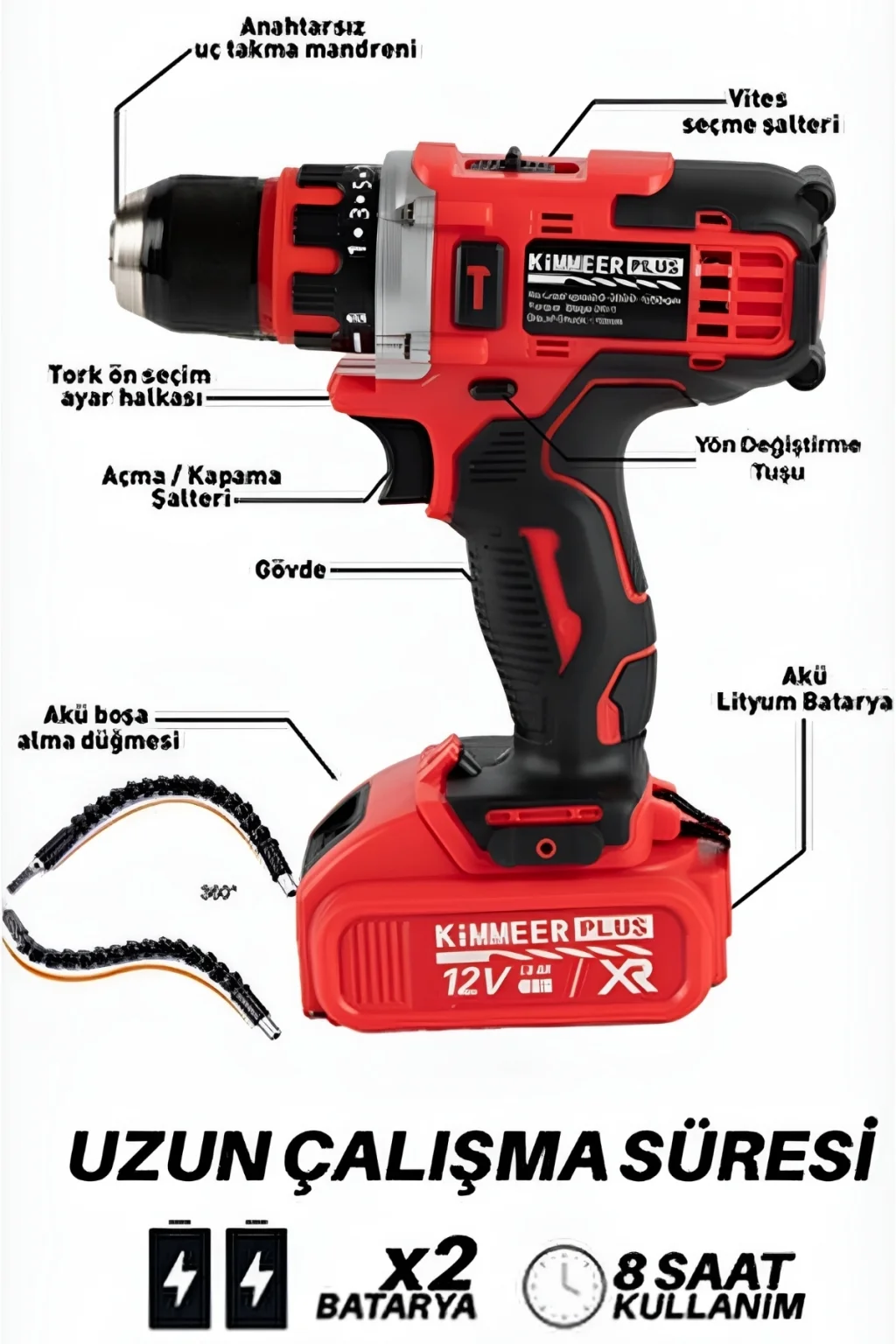 KİMMEER Akülü Matkap, 12V XR Lİ-İON güçlü bataryası ve kömürlü motoru ile hassas ve güçlü delme işlemleri yapmanızı sağlar. 2 vitesli yapısı ve LED aydınlatması ile karanlık ortamlarda bile rahat kullanım sunar.